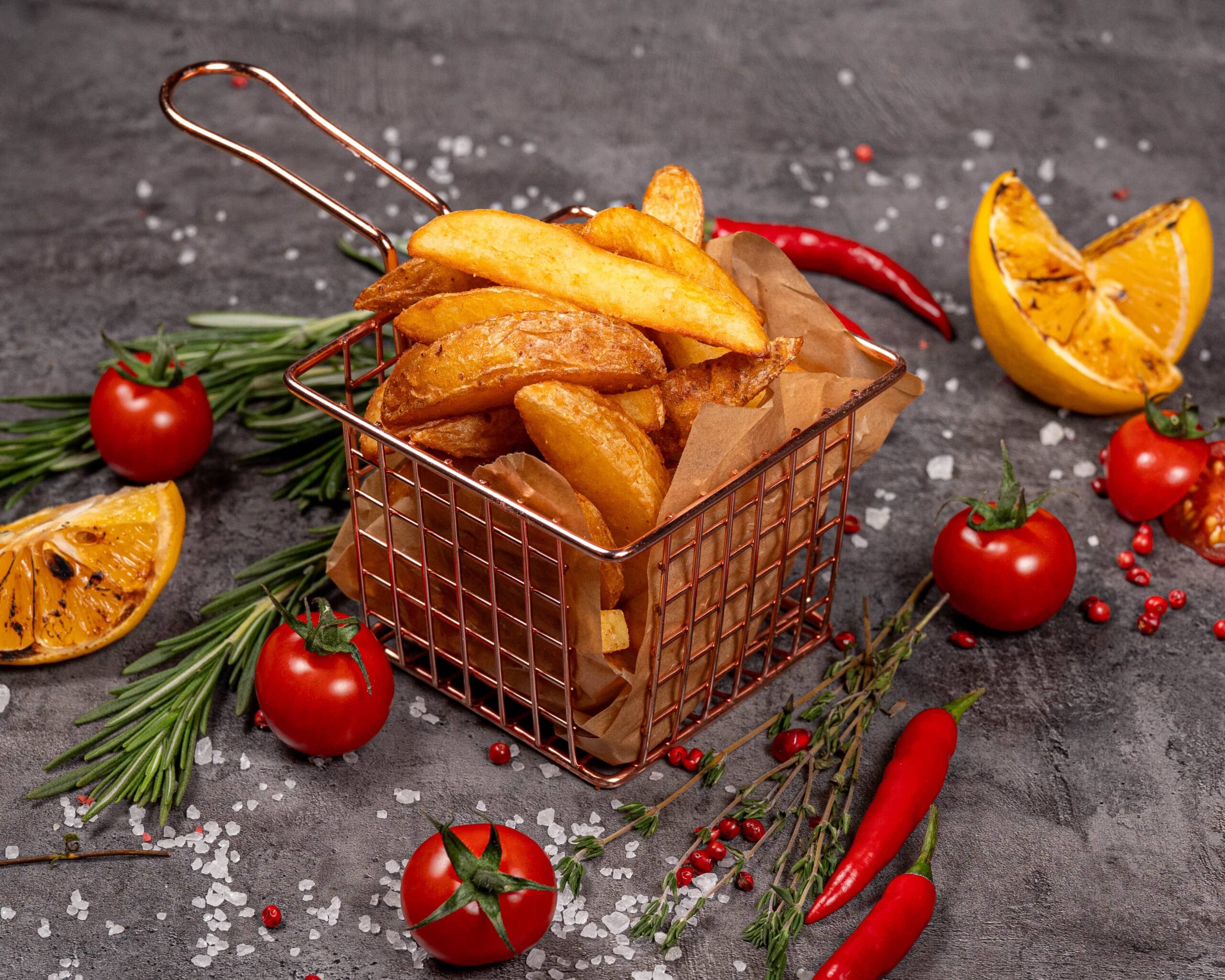 Хрустящий снаружи и мягкий внутри картофель. Приправлен специями и обжарен в растительном масле. Идеально дополняет основные блюда.