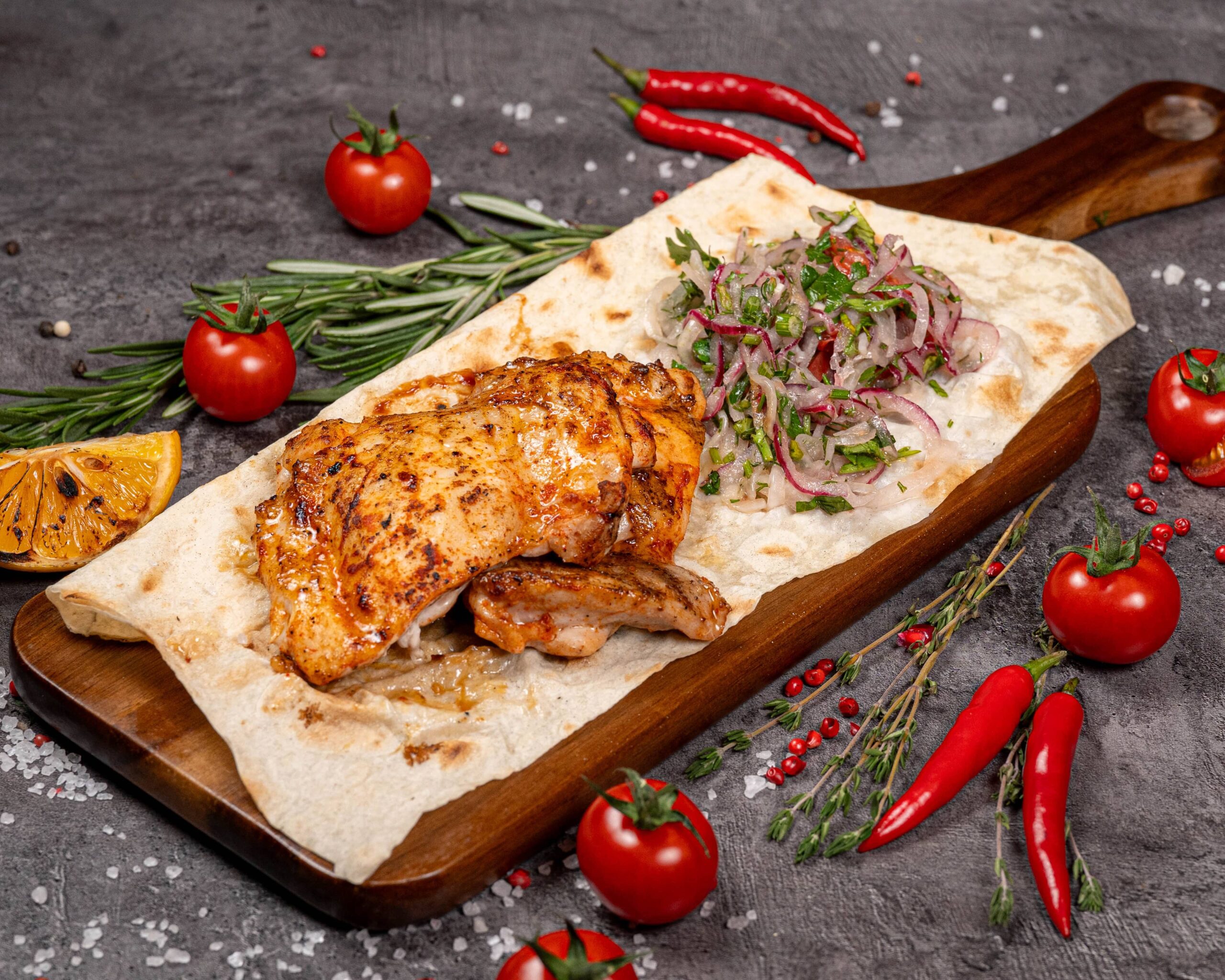 Сочное куриное бедро, приготовленное на гриле, подарит вам истинное гастрономическое наслаждение. Нежный вкус мяса гармонично дополняется свежестью микса лука и зелени, а лаваш станет отличным дополнением к этому блюду. Попробуйте — и ощутите всю глубину вкусовых оттенков
