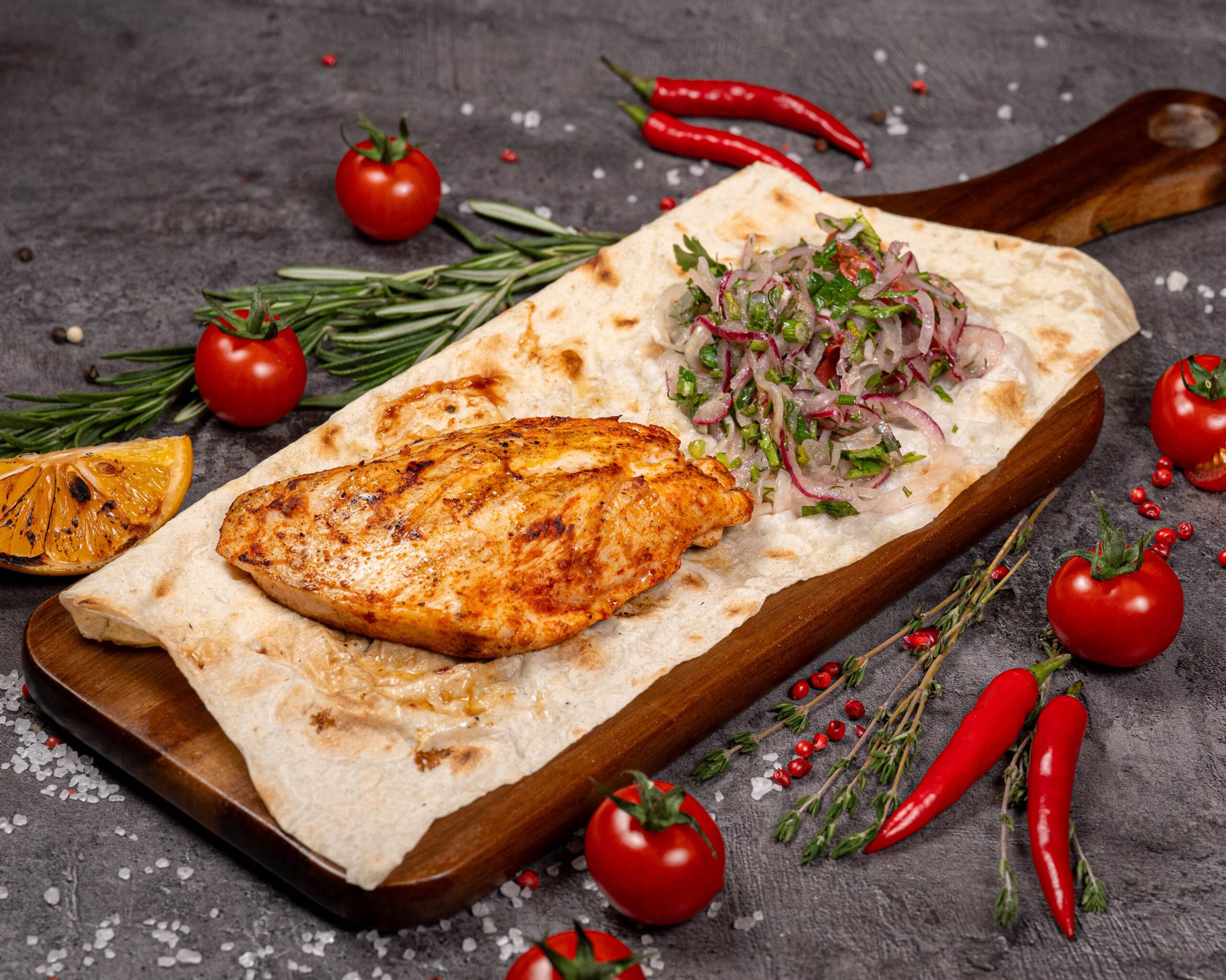 Сочное куриное филе, приготовленное на гриле. Маринад придаёт мясу насыщенный вкус, а микс лука и зелени — свежесть. Подаётся с лавашом.
